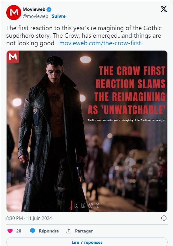 Sorti en 1994, The Crow est resté dans les mémoires comme le dernier film de Brandon Lee, décédé pendant le tournage. Un remake du film a récemment été produit, avec Rupert Sanders à la réalisation et Bill Skarsgård dans le rôle principal. Malheureusement, un premier avis sur le remake est peu encourageant, laissant planer le doute sur sa qualité.