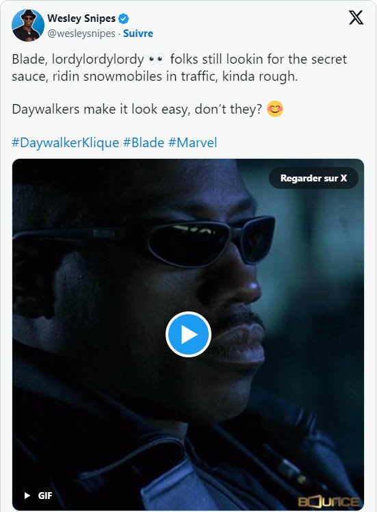 Finie la bienveillance, l’ancienne action star des années 1990 s’est ouvertement moqué des derniers atermoiements de Marvel sur son compte X (anciennement Twitter), avec un GIF de Blade lâchant un sourire crispé en guise d’illustration : « Blade, doux Jésus, les gars cherchent encore la formule secrète, ils conduisent des chasse-neiges dans les embouteillages, c’est compliqué. Ça avait l’air facile pour les diurnambules, n’est-ce pas ?«