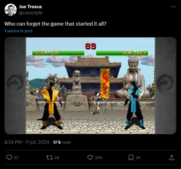 Dans ce premier post du 22 juin 2024, il semblait déjà teaser le retour du premier Mortal Kombat. Depuis, l’homme a redonné de l’eau au moulin avec une deuxième publication le 11 juillet. Cette fois, il demande avec nostalgie : « qui pourrait oublier que ce jeu à tout lancer ? ». Malgré un usage douteux de l’IA qui donne notamment toujours des mains approximatives, les joueurs se montrent globalement enthousiaste en commentaire.