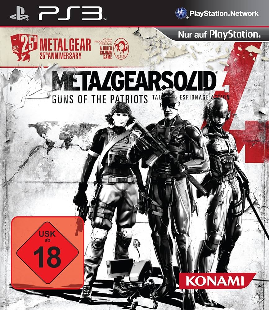 Metal Gear Solid 4: Guns of the Patriots est un jeu vidéo d’action-aventure et d’infiltration développé par Kojima Productions et publié par Konami. Sorti en exclusivité sur PlayStation 3 en juin 2008, il constitue le quatrième opus principal de la série Metal Gear créée par Hideo Kojima.