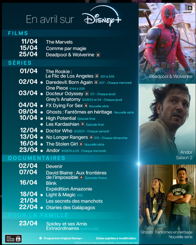 Le film The Marvels (Captain Marvel 2), qui sera disponible sur Disney+ le 11 avril 2025, est considéré comme un échec malgré un premier épisode apprécié. Les abonnés pourront se faire leur propre opinion, et plusieurs documentaires sont également prévus parmi les nouveautés mensuelles.