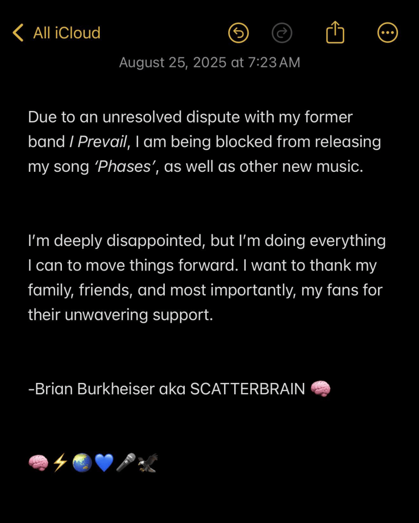 Brian Burkheiser a annoncé sur ses réseaux sociaux qu’il ne peut pas publier ses projets personnels en raison d’un différend avec son ancien groupe I Prevail, l’empêchant de sortir sa chanson « Phases » et d’autres musiques. Il exprime sa déception et remercie sa famille, ses amis et ses fans pour leur soutien.