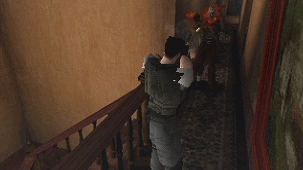La gestion de l’inventaire est un casse-tête à elle seule. Jill peut porter 8 objets contre seulement 6 pour Chris, mais dans les deux cas on se sent vite à l’étroit. Faut-il prendre ce fusil à pompe ou cette clé en forme d’épée ? Emporter des herbes de soin ou des munitions supplémentaires ? Le jeu oblige à faire des choix cornéliens, d’autant que les munitions sont très limitées – vous ne pouvez clairement pas zigouiller tous les monstres et il faut souvent privilégier la fuite. Heureusement, des coffres de stockage magique (liés entre eux on ne sait trop comment) permettent de déposer le surplus pour le récupérer plus tard, dans les salles de sauvegarde. Celles-ci abritent aussi les fameuses machines à écrire sur lesquelles on peut sauvegarder sa partie… seulement si l’on a trouvé des rubans encreurs en nombre suffisant, un luxe qui force le joueur à réfléchir à deux fois avant d’enregistrer sa progression. Cette mécanique de sauvegarde limitée, anxiogène à souhait, est devenue emblématique de la série. Elle illustre bien l’esprit du jeu : chaque balle, chaque objet et chaque sauvegarde est précieuse.
