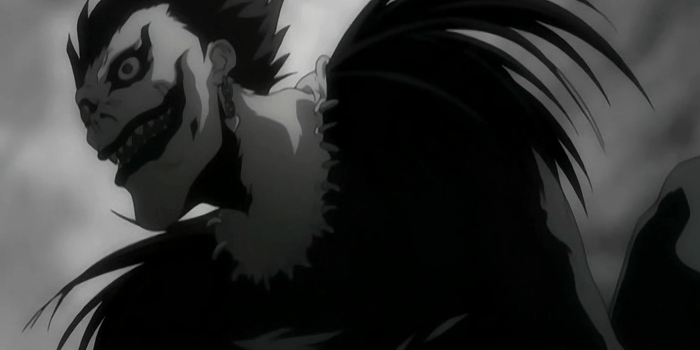 Ryuk est le shinigami qui a laissé tomber le carnet par ennui. Avec son sourire carnassier et son amour obsessionnel pour les pommes (qui agissent sur les shinigami comme la nicotine), il observe l’issue du jeu avec le détachement d’un commentateur de match. C’est grâce à lui que la plupart des moments comiques de la série voient le jour : il est plus intéressé par l’approvisionnement en fruits que par les dilemmes moraux.