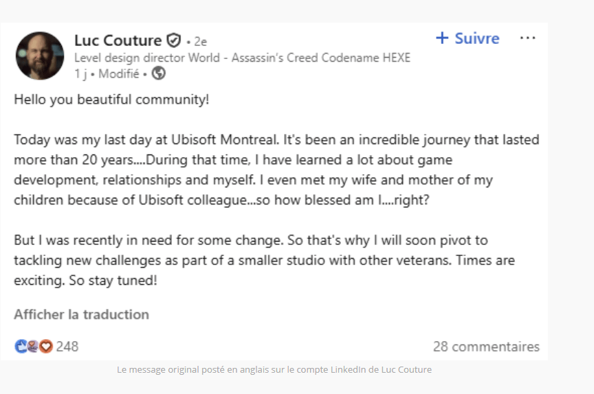 Il explique même avoir rencontré sa femme et fondé une famille grâce à ses rencontres chez Ubisoft. « Mais j’avais récemment besoin de changement », confie l’ancien développeur d’Assassin’s Creed. « C’est pour cela que je vais bientôt affronter de nouveaux challenges en rejoignant un plus petit studio avec d’autres vétérans », écrit-il en conclusion en invitant ses fans à rester à l’affût des informations.