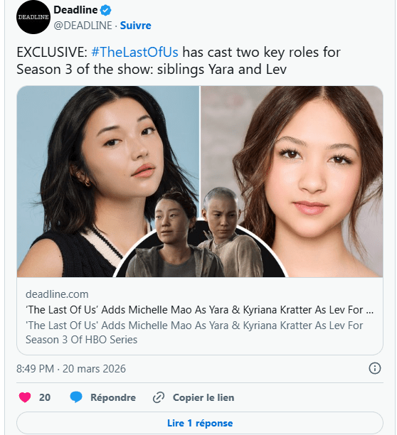 Deadline annonce l’ajout de Michelle Mao, vue dans La Chronique des Bridgerton, et Kyriana Kratter, connue pour son rôle dans [Star Wars : Skeleton Crew], au casting de la saison 3 de The Last of Us.